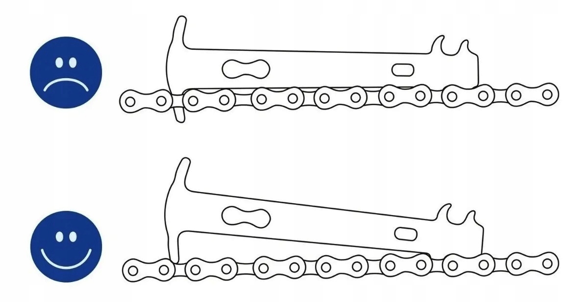 Na przymiarze mamy 2 oznaczenia, 75 i 1.0. Gdy przyłożymy przymiar stroną z oznaczeniem 75 i ząb nie wchodzi nam między ogniwa, oznacza to że możemy ten łańcuch jeszcze eksploatować. Gdy jednak wejdzie on między ogniwa, oznacza to że nasz łańcuch zużyty jest w 75% i nadaje się do wymiany. Warto wtedy sprawdzić, czy strona z oznaczeniem 1.0 również wchodzi między ogniwa. Jeżeli tak, oznacza to że najprawdopodobniej do wymiany mamy również cały napęd.