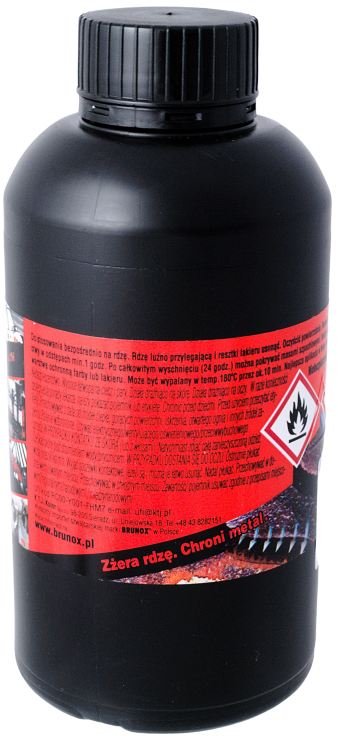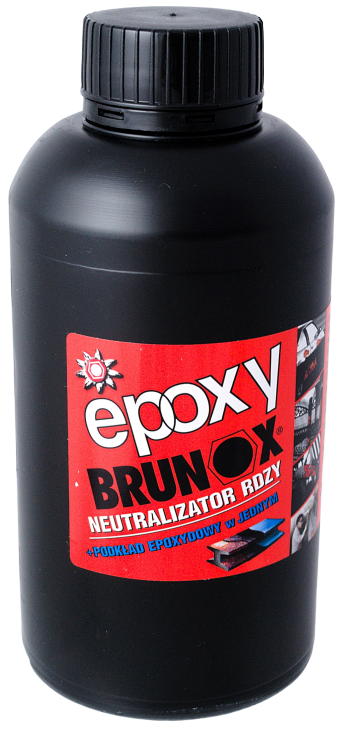 do przemysłowego zabezpieczania konstrukcji, instalacji, maszyn, pojazdów itp. Brunox® Epoxy stanowi opatentowany system odrdzewiający na bazie żywicy epoksydowej. Przezroczysta ciecz o barwie bursztynu tworzy ze zneutralizowaną warstwą korozji organiczny związek żelaza. Powstająca czarna, bardzo zwięzła i odporna warstwa zapewnia długotrwałą ochronę antykorozyjną i dzięki zawartości żywicy epoksydowej, stanowi równocześnie doskonałą warstwę gruntującą. Preparat ten nadaje się wyśmienicie de renowacji maszyn, instalacji, pojazdów. Dzięki szczególnie dobrej penetracji w pory powstałe w wyniku korozji oraz doskonałemu tworzeniu warstwy ochronnej (brak śladów pociągnięć pędzlem) zapewniona jest znakomita efektywność i możliwość nakładania nań rozmaitych powłok (farb, lakierów, szpachlówek – również chemo-utwardzalnych).
