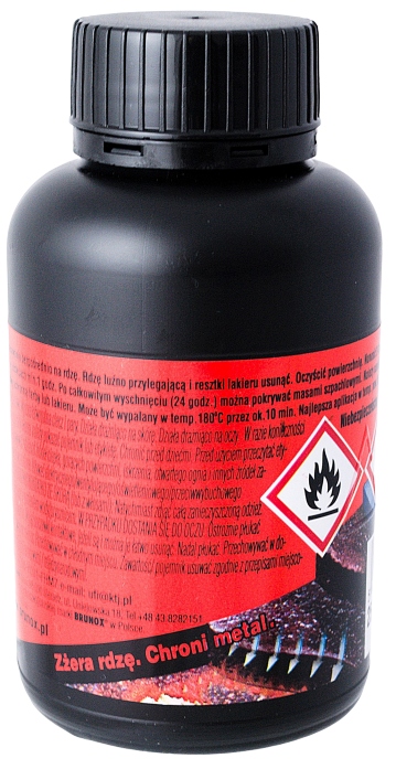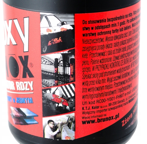do przemysłowego zabezpieczania konstrukcji, instalacji, maszyn, pojazdów itp. Brunox® Epoxy stanowi opatentowany system odrdzewiający na bazie żywicy epoksydowej. Przezroczysta ciecz o barwie bursztynu tworzy ze zneutralizowaną warstwą korozji organiczny związek żelaza. Powstająca czarna, bardzo zwięzła i odporna warstwa zapewnia długotrwałą ochronę antykorozyjną i dzięki zawartości żywicy epoksydowej, stanowi równocześnie doskonałą warstwę gruntującą. Preparat ten nadaje się wyśmienicie de renowacji maszyn, instalacji, pojazdów. Dzięki szczególnie dobrej penetracji w pory powstałe w wyniku korozji oraz doskonałemu tworzeniu warstwy ochronnej (brak śladów pociągnięć pędzlem) zapewniona jest znakomita efektywność i możliwość nakładania nań rozmaitych powłok (farb, lakierów, szpachlówek – również chemo-utwardzalnych).