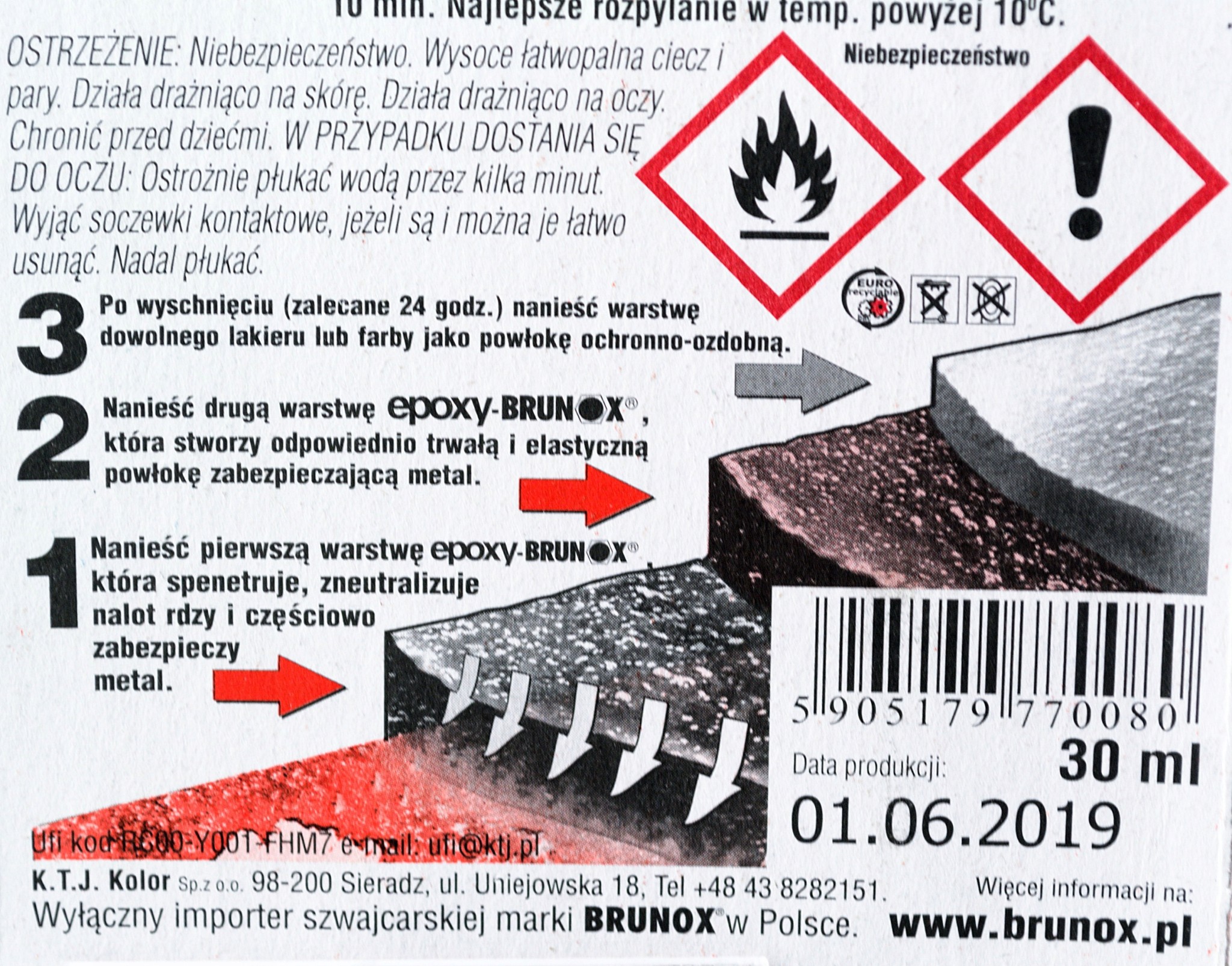 BRUNOX® Epoxy Spray – chronić przed bezpośrednim działaniem promieni słonecznych i temperaturą powyżej 50°C. Gwarancja poprawnego natrysku przez okres trzech lat. UWAGA – SPRAY może wybuchnąć!