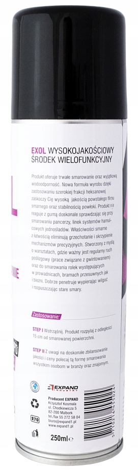 EXOL to preparat odznaczający się doskonałymi właściwościami penetrującymi, które likwidują grzechotanie i skrzypienie ruchomych elementów. Pozostawia cienki ochronny film obojętny dla elastomerów i innych tworzyw sztucznych. Warstwa ochronna jest odporna na deszcz i wymywanie słoną wodą. Produkt szczególnie polecany do smarowania i konserwacji: