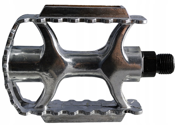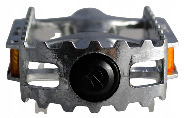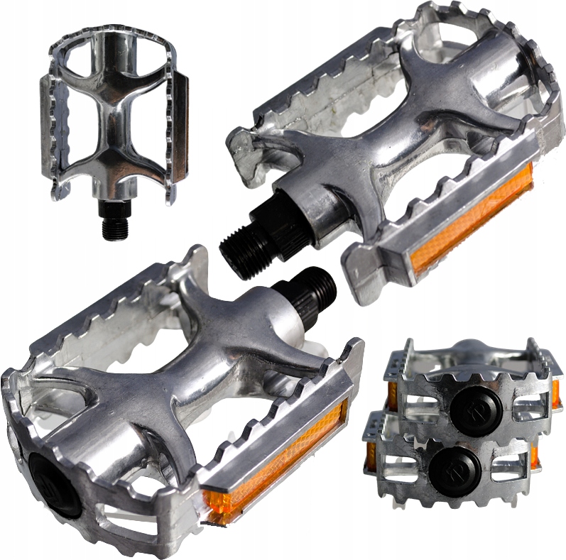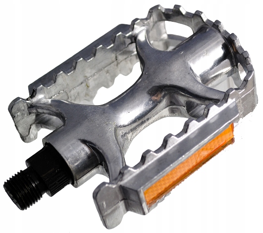Solidne odlewane pedały aluminiowe w kolorze srebrnym, z odblaskami.