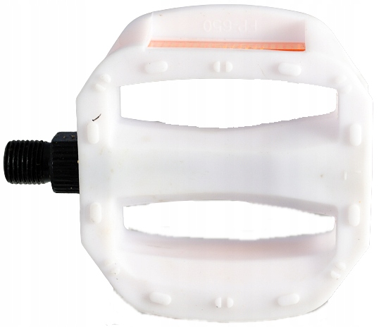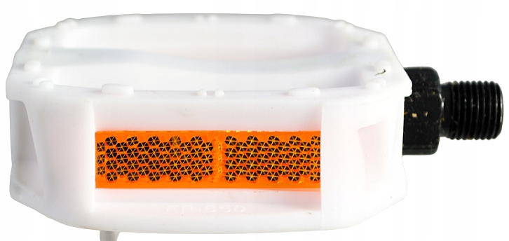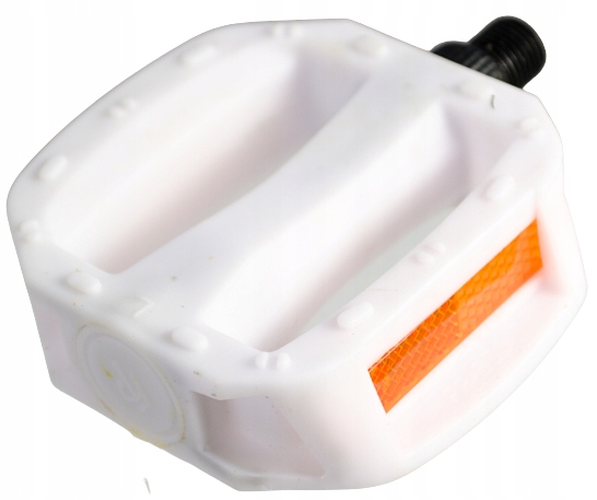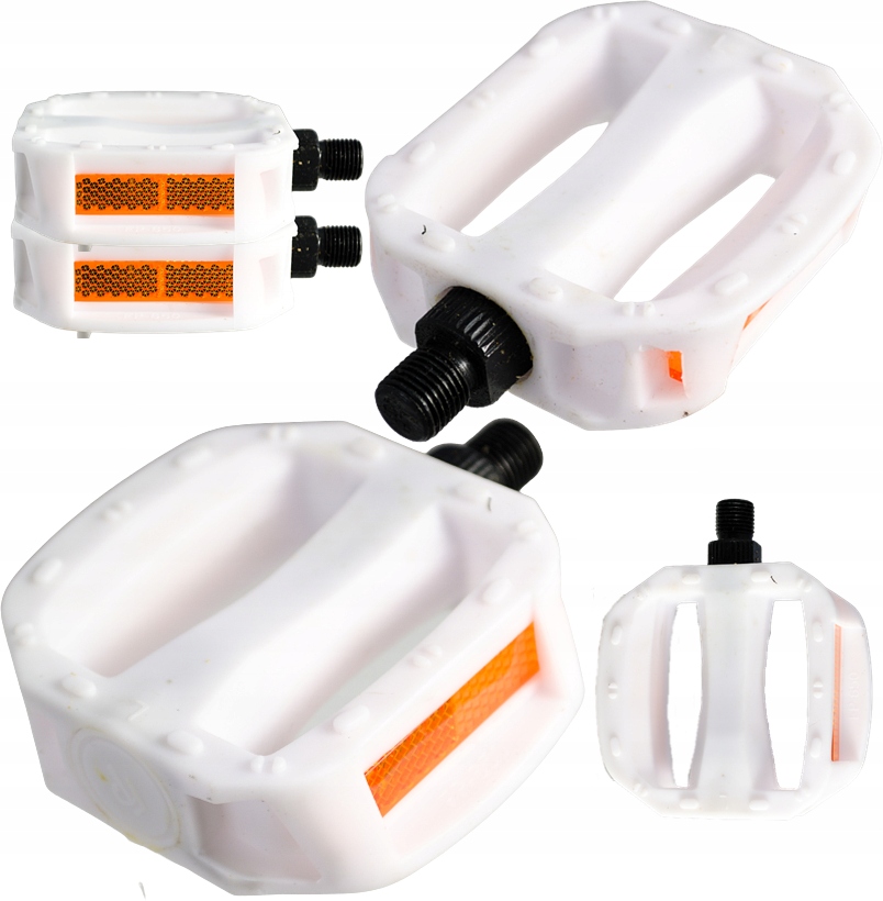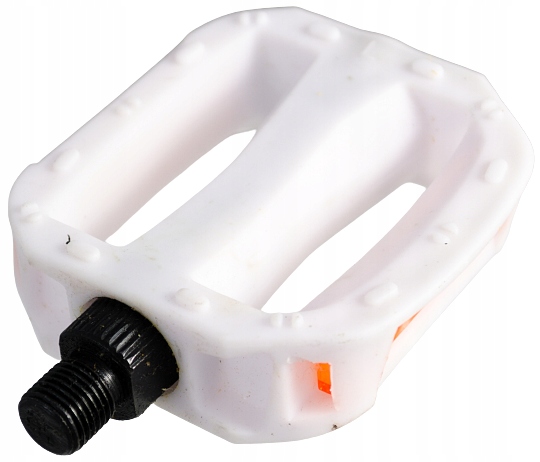 Wytrzymałe pedały plastikowe w kolorze białym z odblaskami.