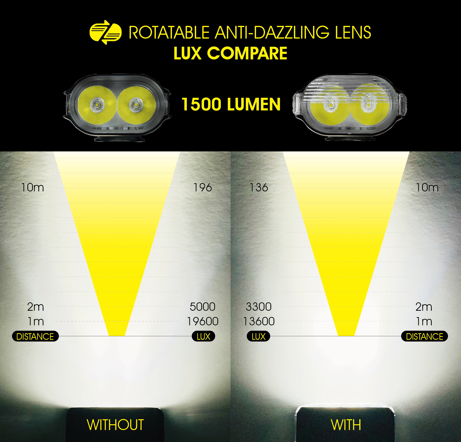 Funkcja zdejmowanej soczewki pozwala dostosować lampkę do trybu jazdy. Gdy poruszamy się poza drogami, można zdemontować soczewkę odcinającą strumień światła dla maksymalnego oświetlenia. Na drogach publicznych, soczewka z odcięciem pozwoli nie oślepiać kierujących. Można ją odwrócić, w zależności od sposobu montazu lampki