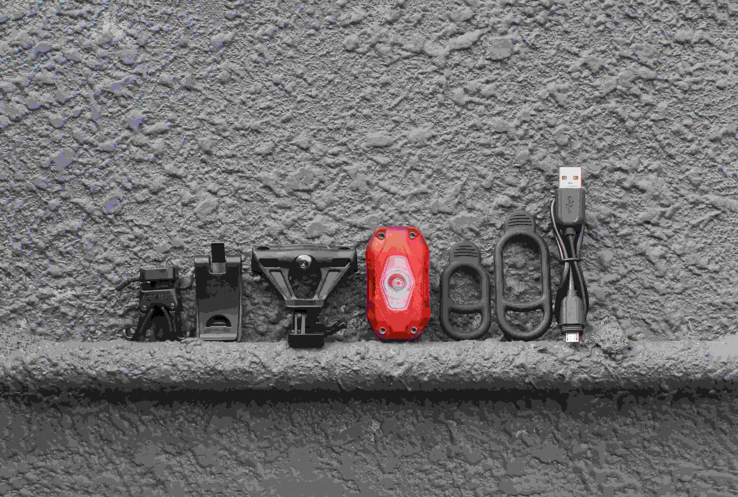 W zestawie znajdują się 3 uchwyty. Uniwersalny rowerowy, który można dopasować do każdego kształtu o średnicy od 20 do 52mm, uchwyt do paska a także uchwyt do szyny siodełka roweroweg. Czyni to lampkę bardzo uniwersalną