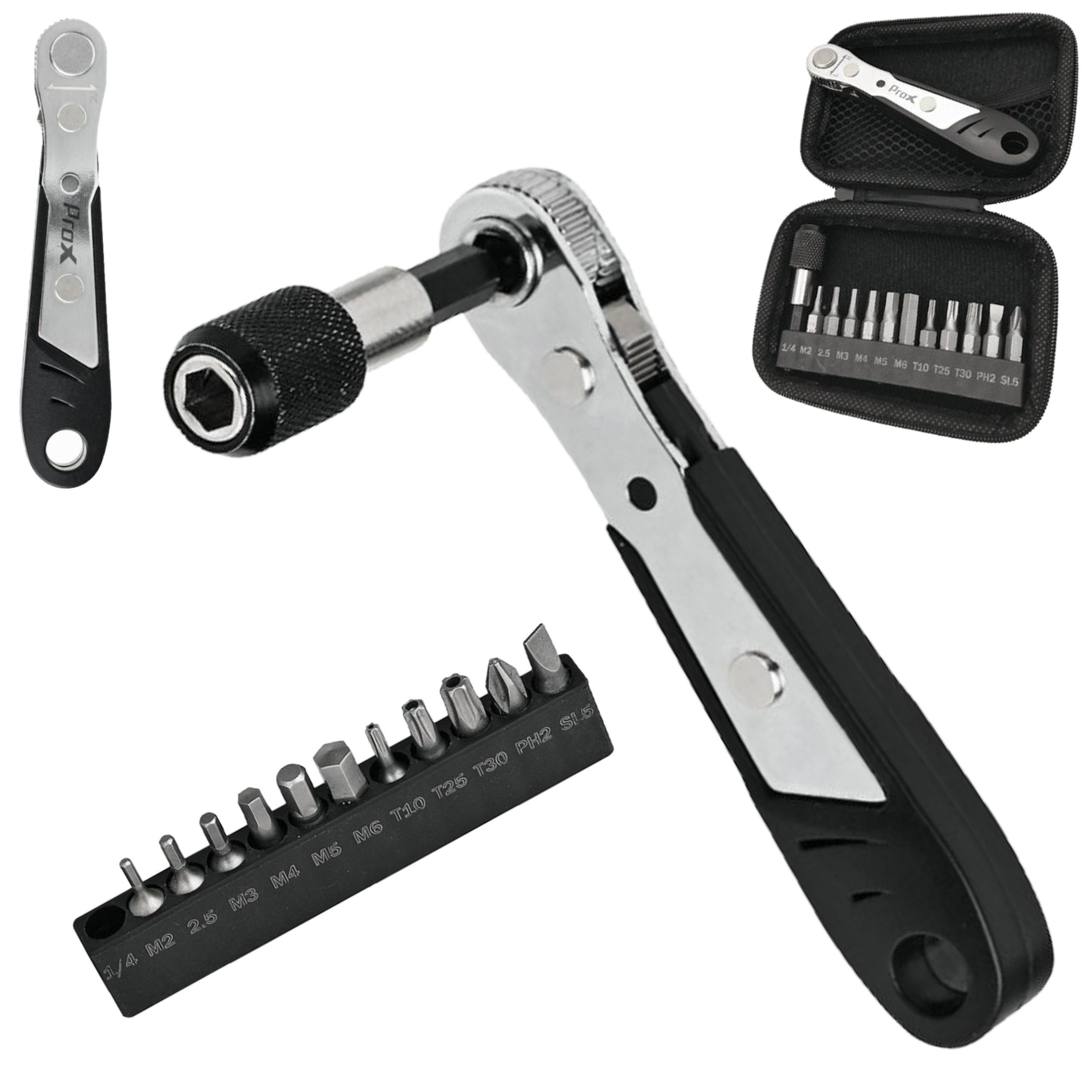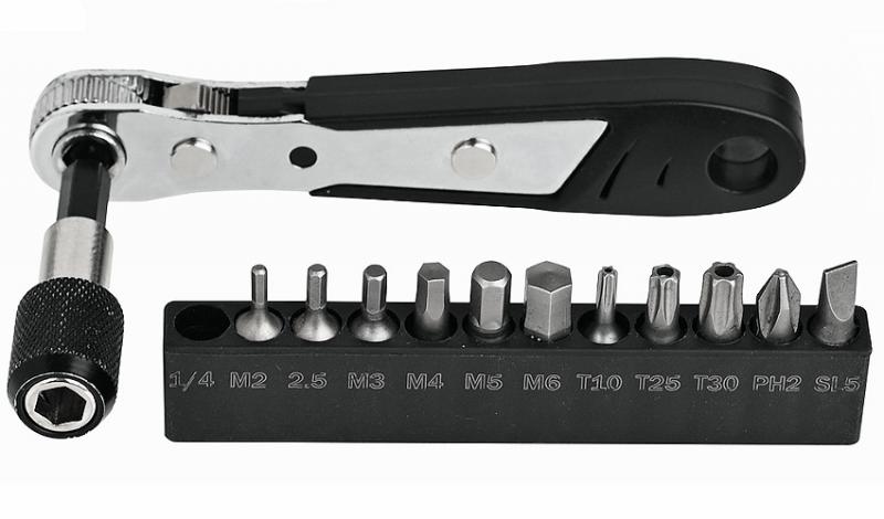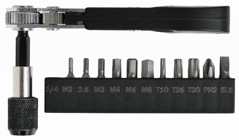 - Kieszonkowy klucz typu grzechotka z przedłużką i zestawem bitów