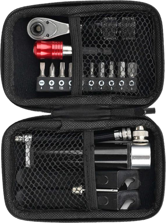 Podręczny zestaw kluczy rowerowych z wygodną grzechotką, zestawem naprawczym i pompką. Idealny aby zawsze mieć go przy sobie na dnie sakwy w trakcie wyprawy