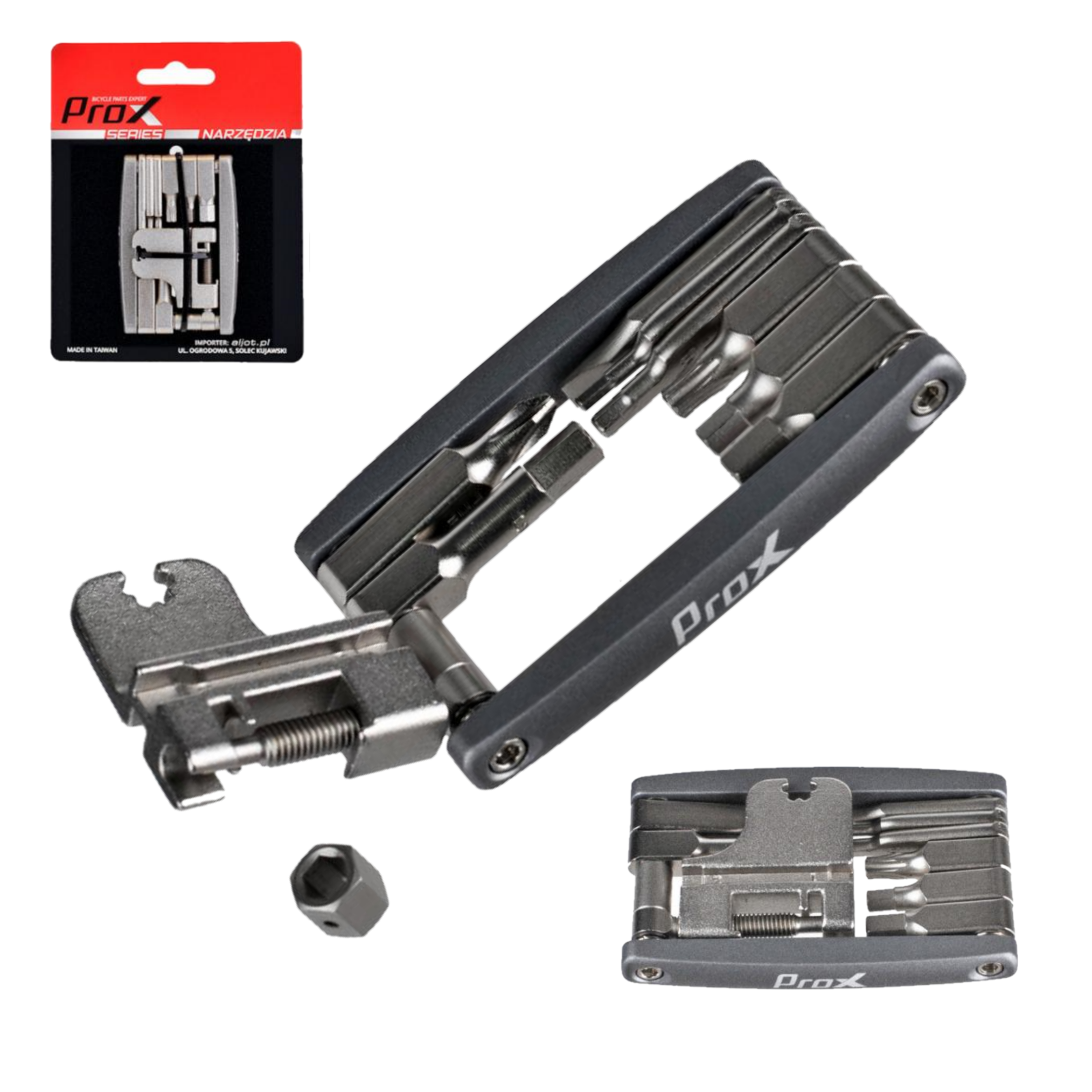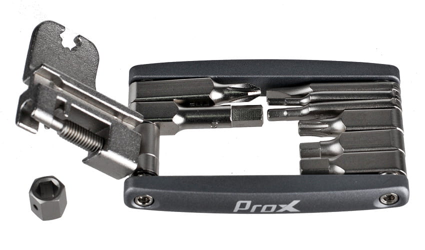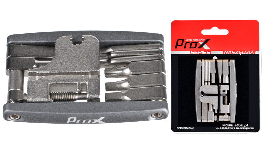 PROX FF-24 multotool wyposażony w 16 finkcji + skuwacz/rozkuwacz do łańcucha rowerowego. Mały rozmiar i niska waga, czynią go bardzo poręcznym. Wykonany z wytrzymałej stali Chromowo-Wanadowej.