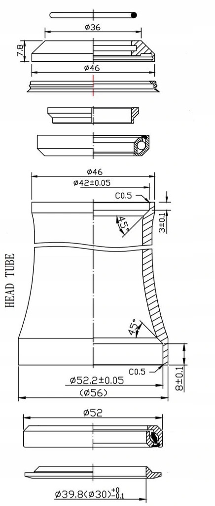 - Średnica wewnętrzna dołu główki ramy: 52,1 mm kąt nacięcia 45st.