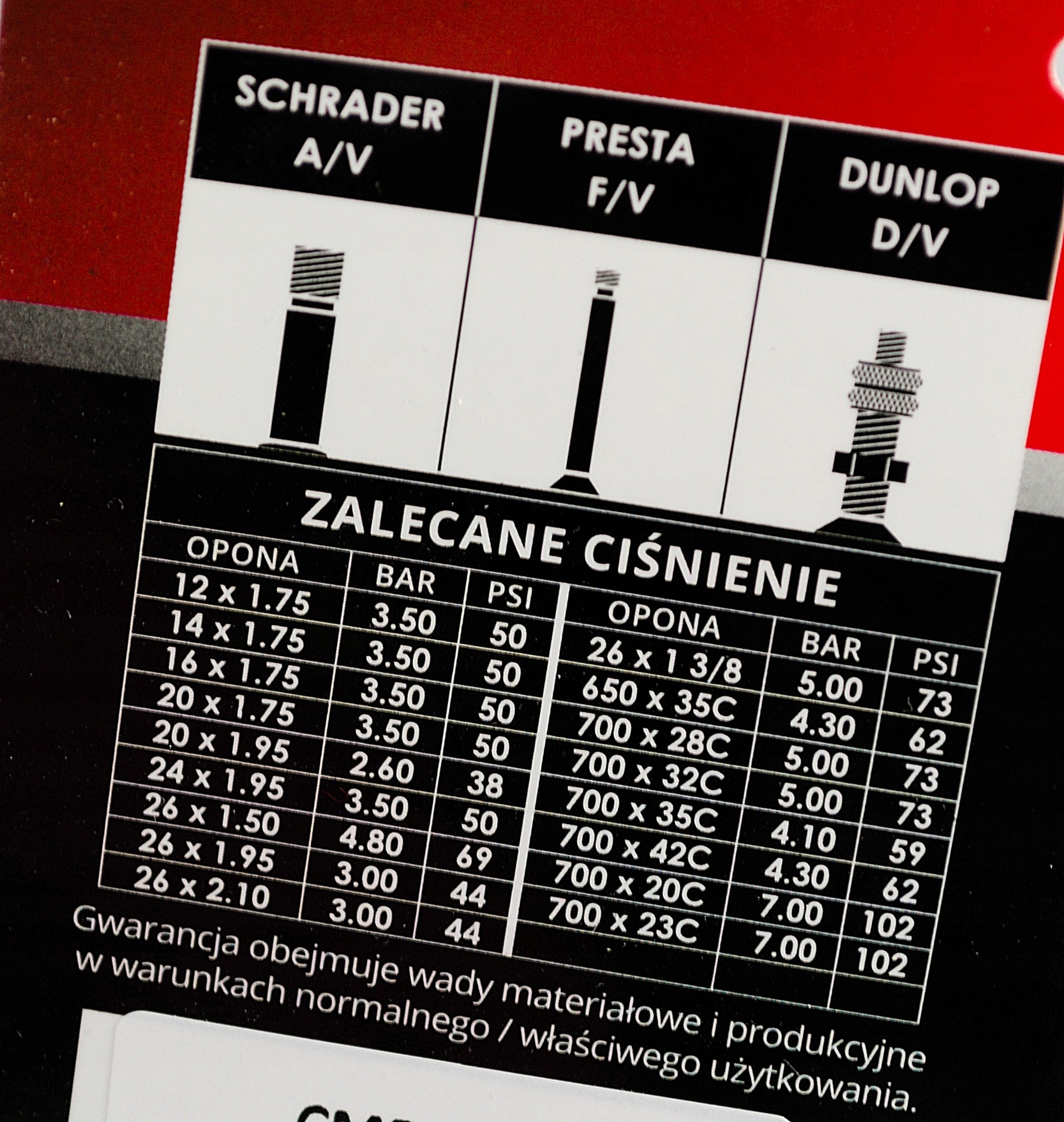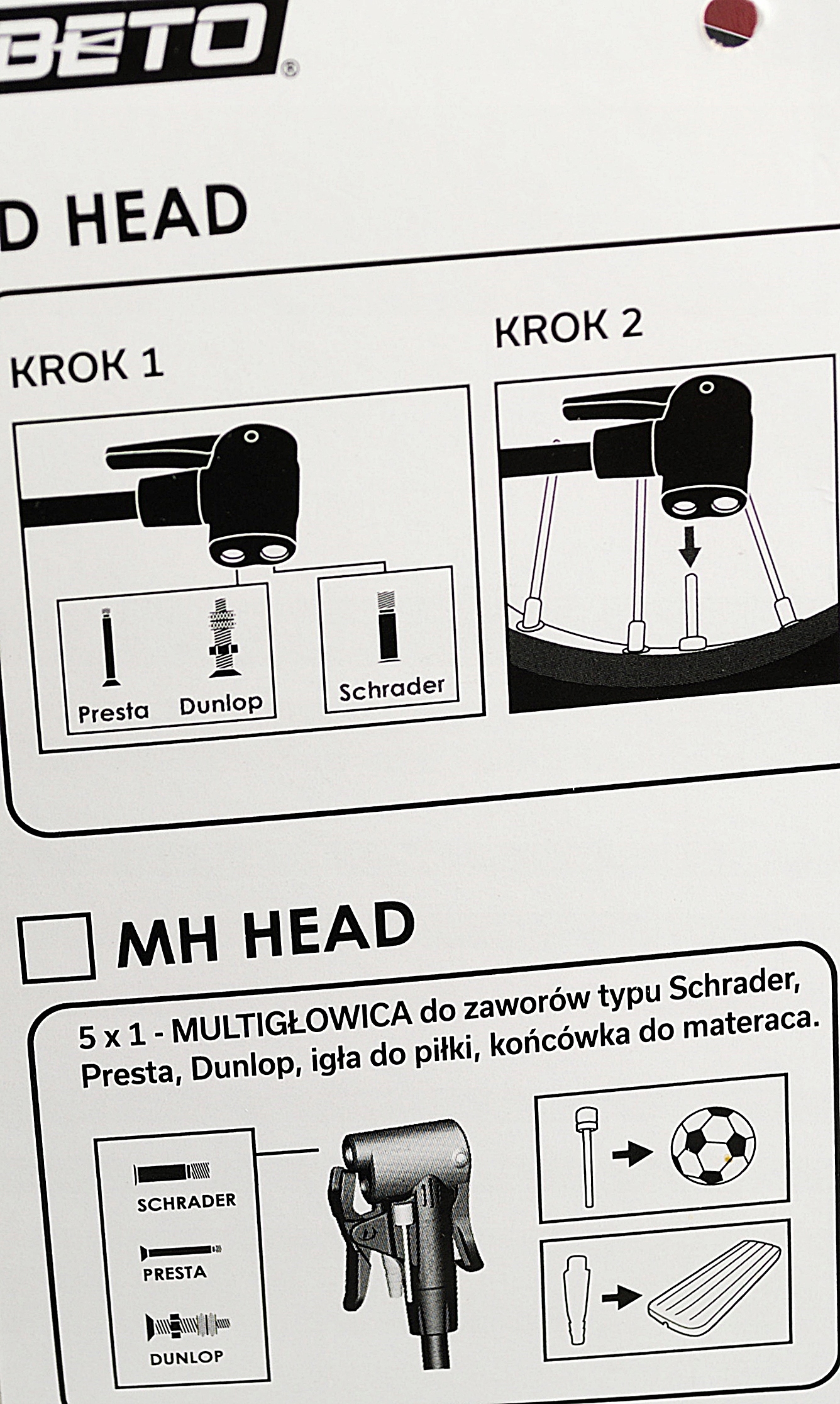 - Głowica kompatybilna z zaworami AV (samochodowy), DV (roweorwy) i FV (presta)