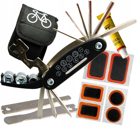 - Kieszonkowy zestaw narzędzi do naprawy roweru, niezbędny każdemu rowerzyście.
