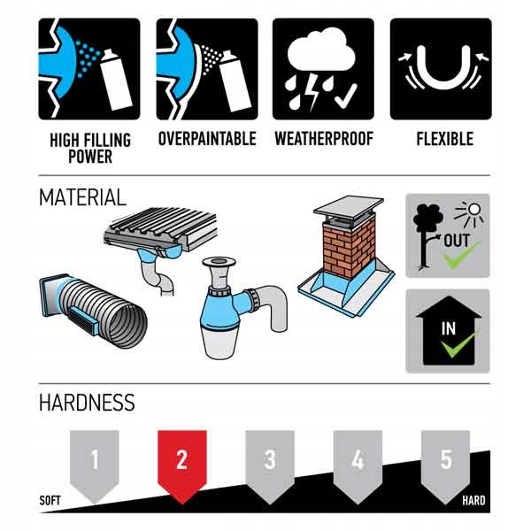 - SpraySeal® wypełnia i uszczelnia nieszczelności i pęknięcia, zapewniając elastyczne, wodoszczelne uszczelnienie, które zapobiega przenikaniu wilgoci, rdzy i korozji. Ma grubopowłokową formułę o wysokiej lepkości, opracowaną specjalnie do wypełniania pęknięć, szczelin i dziur, zachowując przy tym doskonałą elastyczność nawet przy zmianach temperatury, połączeniach z różnych materiałów i promieniowaniu UV.