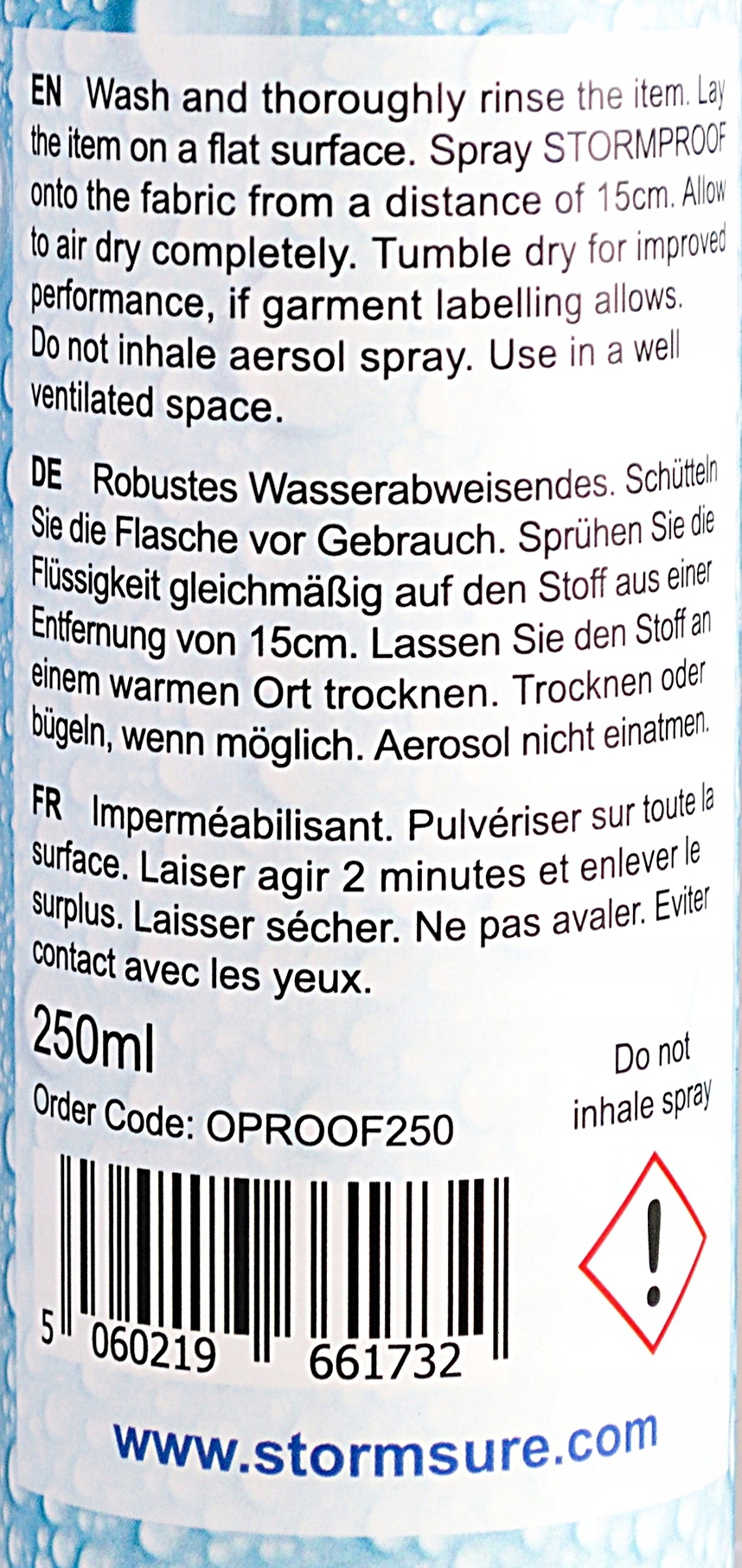 Preparat StormProof nadaje bardzo wytrzymałą warstwę wodoodporną. Gdy wysycha, pozostawia na tkaninie (pomiędzy włóknami) minimalnie cienką warstwę aktywnego środka chemicznego. Warstwa ta po wyschnięciu jest bardzo trwała (fluorowe środki odpychające są uznawane za lepsze od woskowych czy silikonowych), natomiast zaimpregnowana powierzchnia tkaniny staje się hydrofobowa (odpychająca ciecz), a krople wody po prostu po niej spływają.