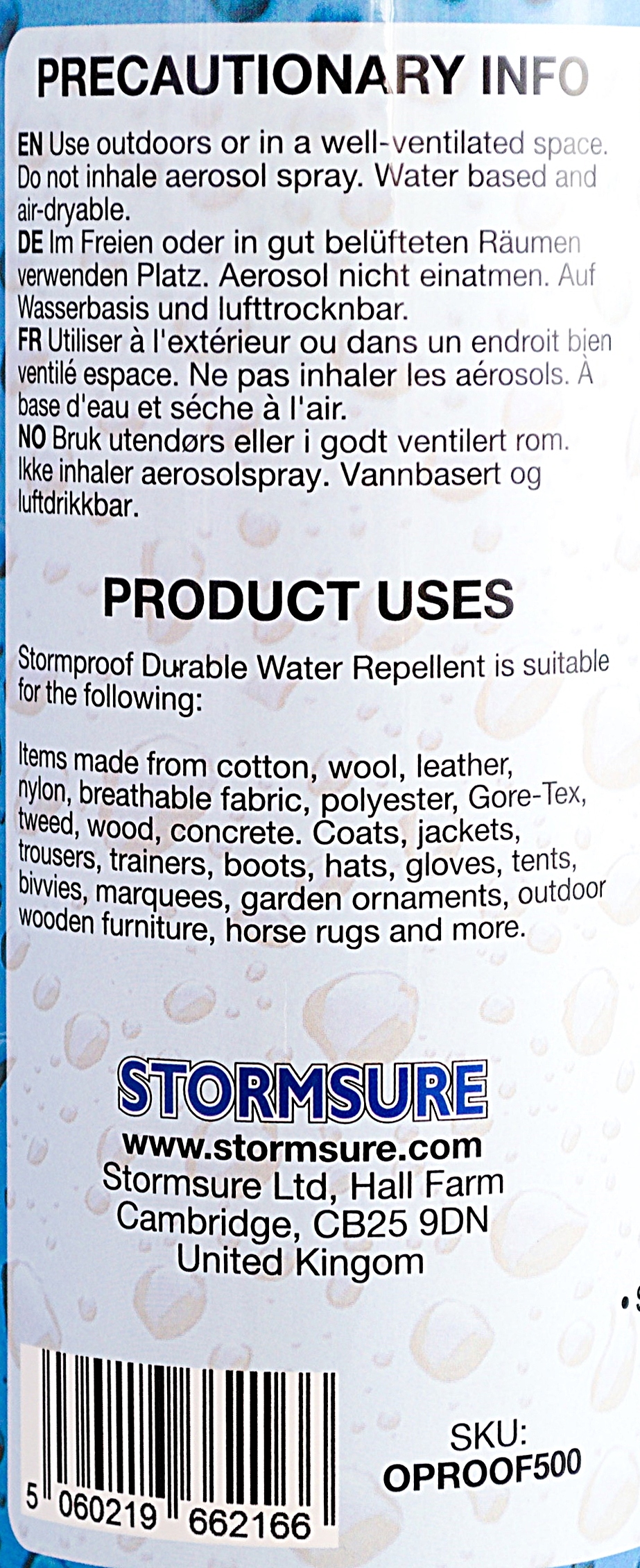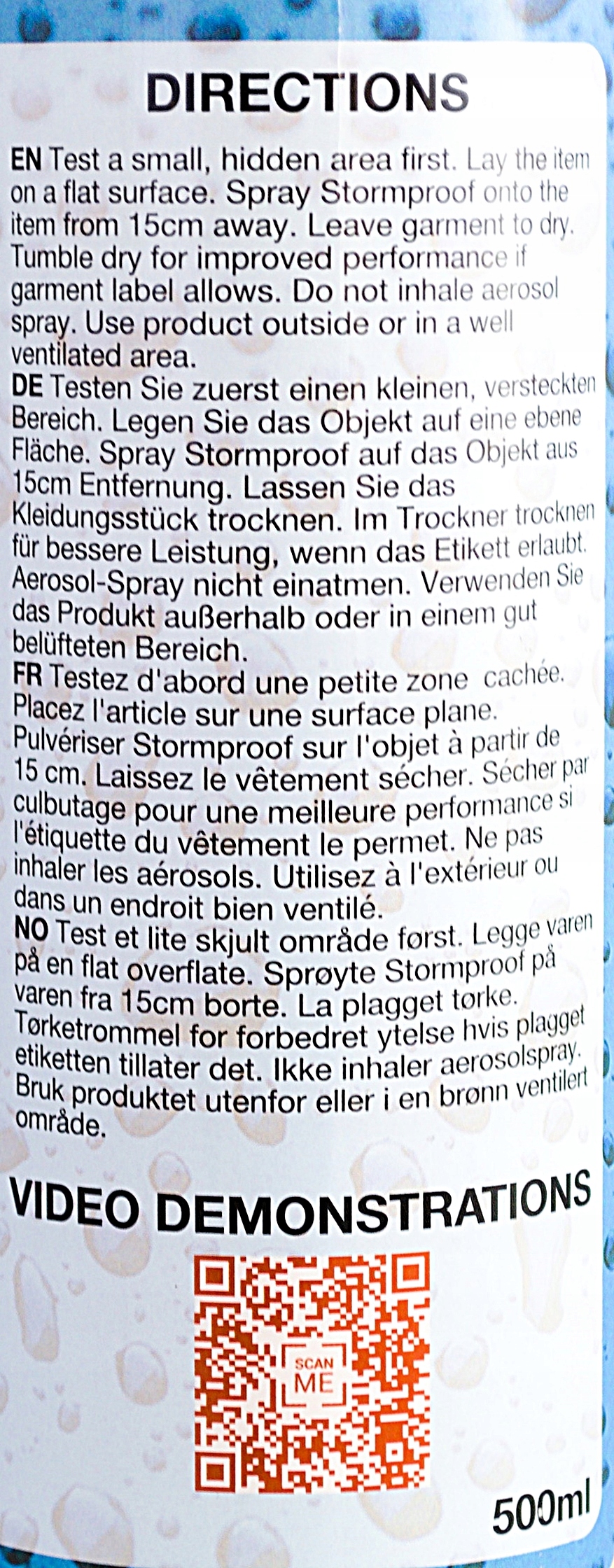 Preparat StormProof nadaje bardzo wytrzymałą warstwę wodoodporną. Gdy wysycha, pozostawia na tkaninie (pomiędzy włóknami) minimalnie cienką warstwę aktywnego środka chemicznego. Warstwa ta po wyschnięciu jest bardzo trwała (fluorowe środki odpychające są uznawane za lepsze od woskowych czy silikonowych), natomiast zaimpregnowana powierzchnia tkaniny staje się hydrofobowa (odpychająca ciecz), a krople wody po prostu po niej spływają.