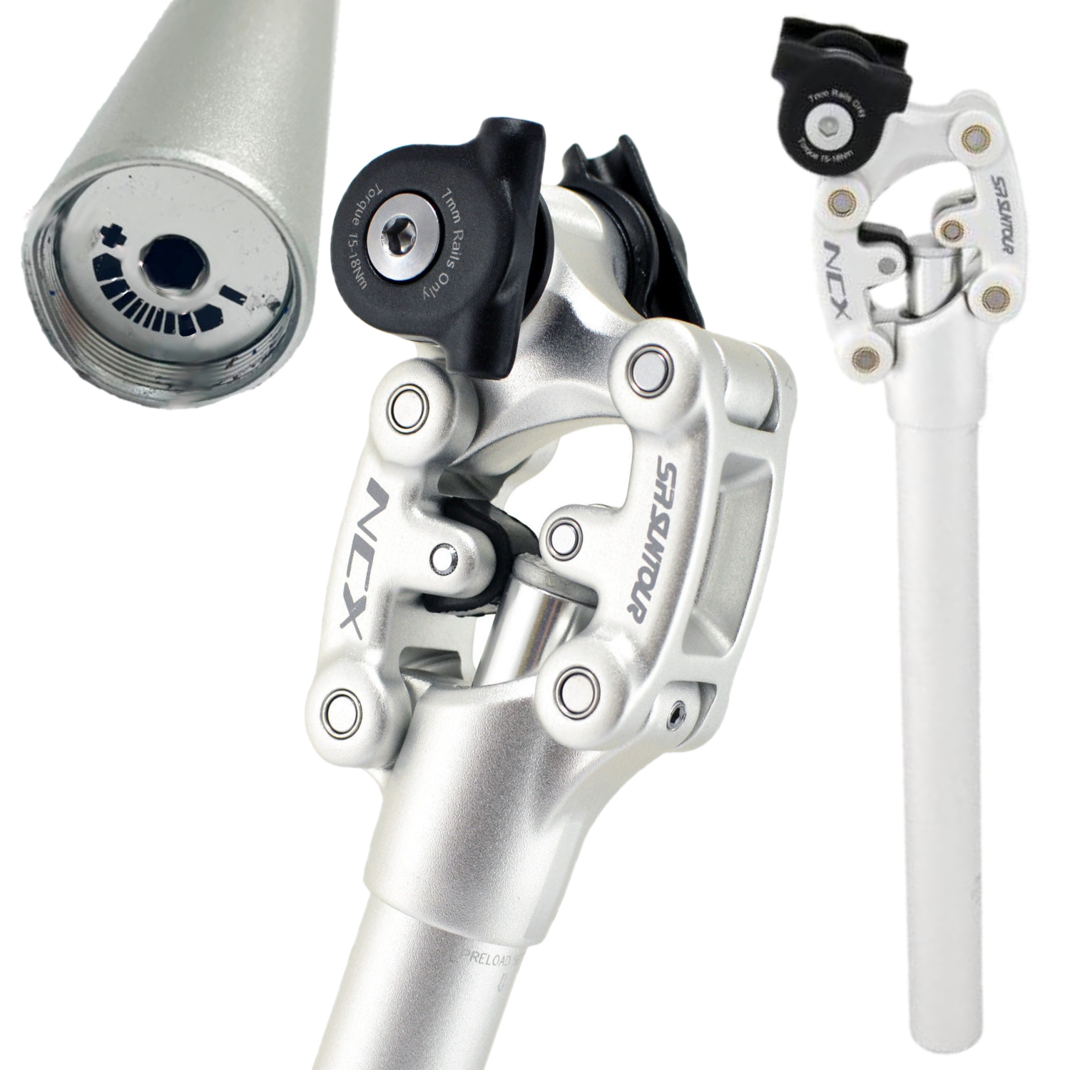 ➡️ Sztyca ze zintegrowanym aluminiowym jarzemkiem. Siodełko mocowane jest jedną śrubą, a możliwość regulacji nachylenia pozwala idealnie dopasować jego położenie.