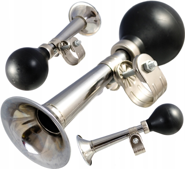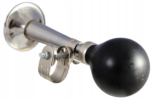 Trąbka metalowo- gumowa na rowerek lub hulajnogę dziecięcą. Wykonana z tworzywa sztucznego oraz z miękkiego, gumowego materiału w kolorze czarnym. W środku znajduje się plastikowy "piszczek", który po naciśnięciu czarnej piłki wydaje głośny pisk.