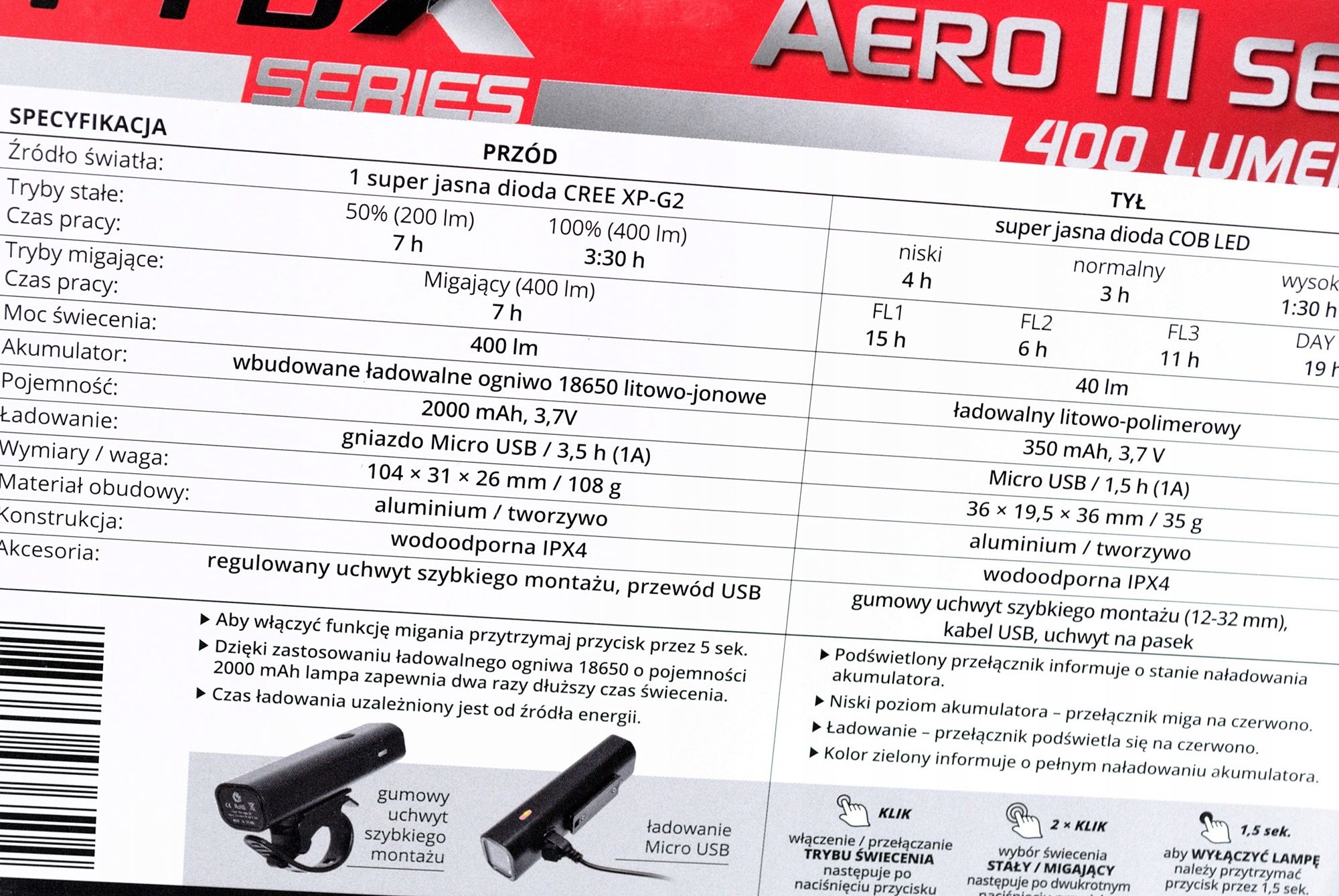 PRO X AERO F III to zestaw dwóch bardzo dobrze wykonanych lampek rowerowych, które gwarantują widoczność w trakcie jazdy i świetnie oświetlają drogę, przed ługi czas dzięki dużym akumulatorom ładowanym przez USB.